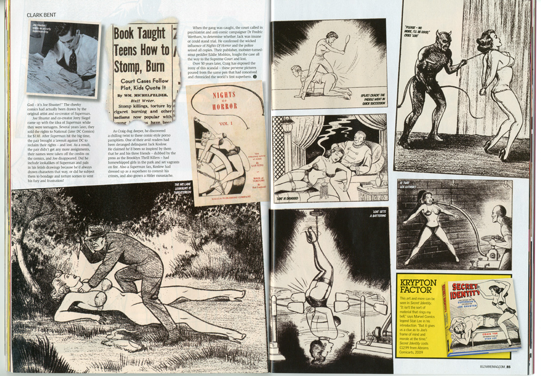 I’m delighted and amused how very different types of media are covering Secret Identity: The Fetish Art of Superman’s Co-Creator Joe Shuster. Since when does USA Today (see below) and the bleeding edge Bizarre Magazine cover the same turf?!? The esteemed comics critic Paul Gravett was drafted to write this one: